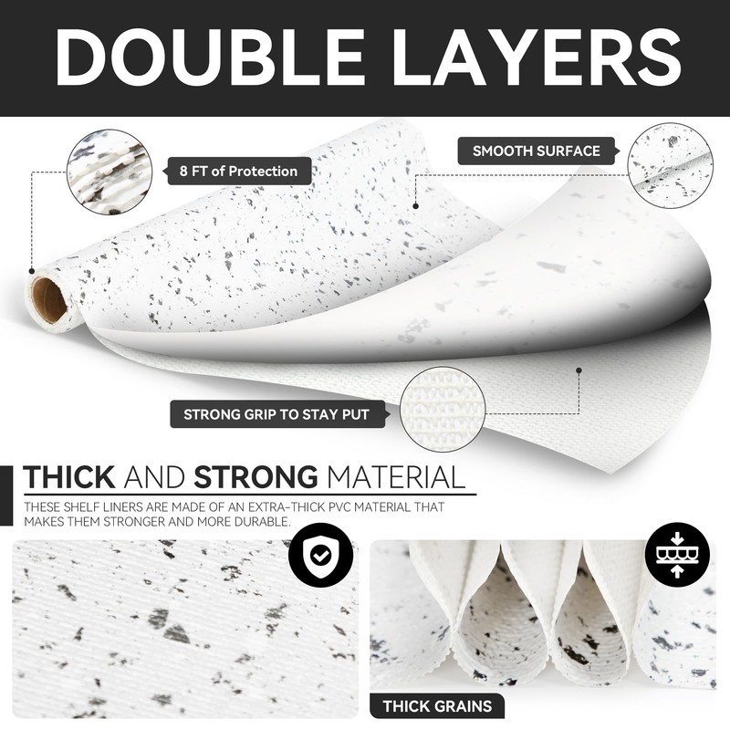 - EASY CARE---RAY STAR heavy duty kitchen cabinet shelf drawer lining is waterproof. The top EVA layer is relatively smooth without small holes, which makes cleaning easier. Just take a damp paper towel to wipe it, and it's clean!