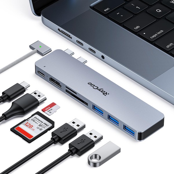 - 【Multi-functional 7-IN-2 USB-C Hub】The RayCue 7-in-2 MacBook dedicated hub has 7 ports, including 1 Thunderbolt 3 port, 1 USB C data transfer port, 3 USB 3.0 ports, 1 TF / SD slot port. It's also the best solution to the problem of lack of ports in work and life