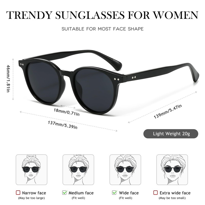 - 【Sunglasses Dimensions and Package】 The sunglasses dimension is: lens width: 49mm, lens height: 46mm, temple length: 137mm and nose bridge: 18mm. The package: 1* sunglasses, 1* Cleaning cloth, 1* Sunglasses pouch and 1* stylish packaging box, which is an excellent gift for women to enjoy the sunshine