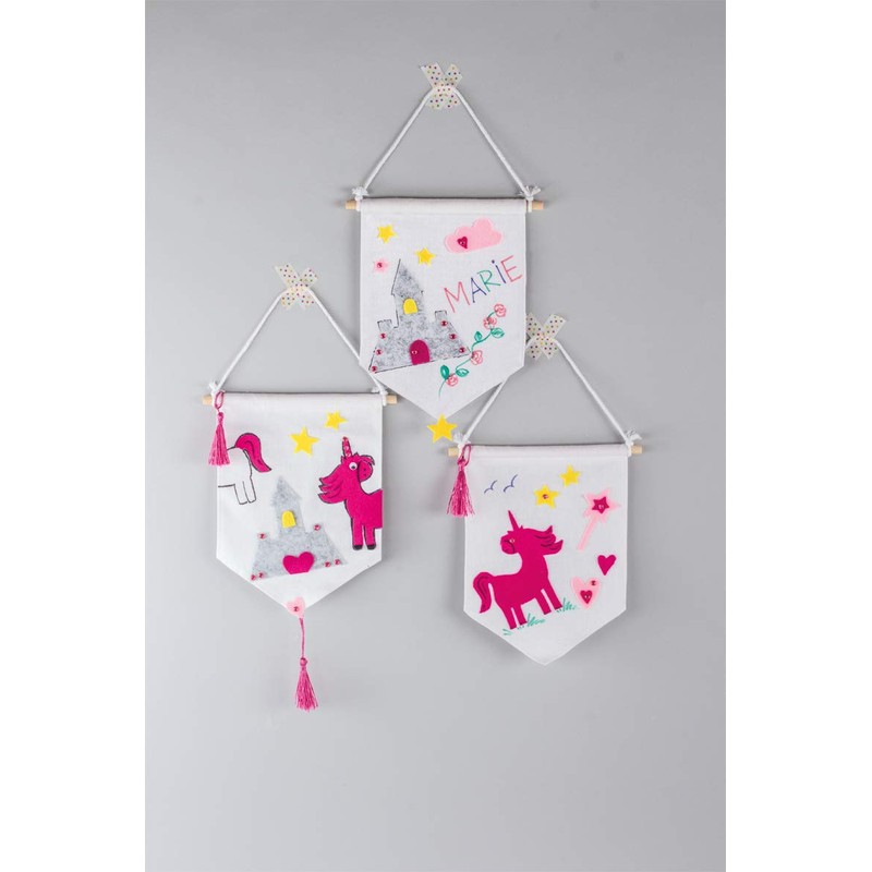 - Contents: 8 white fabric pennants, fabric colouring pens in yellow, red, blue, green, brown, black, 8 sheets of self-adhesive felt in pink, pink, grey, yellow, blue, black, motif templates, decorative material, instructions (English language not guaranteed)
