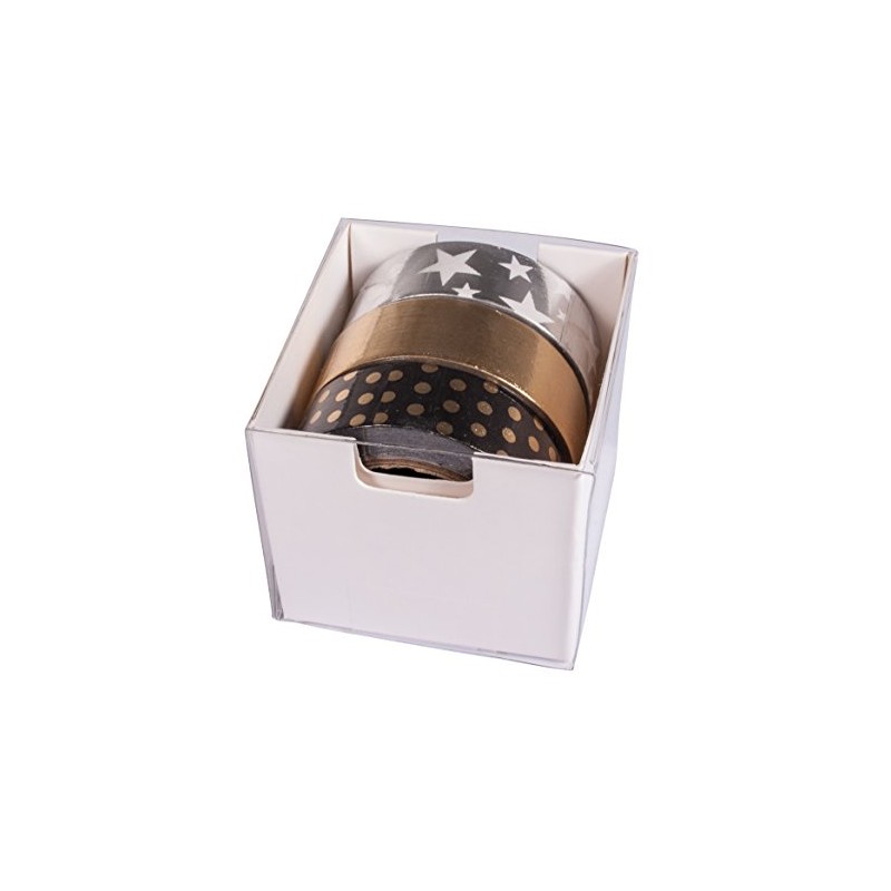 - Box of 3 rolls of 10 m, 15 mm wide: 1 x silver with white stars, 1 x gold plain, 1 x black with gold dots