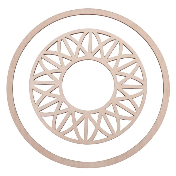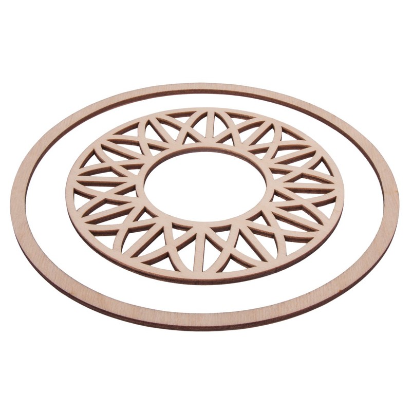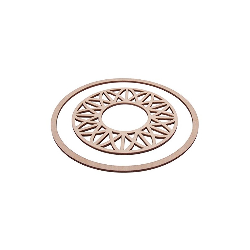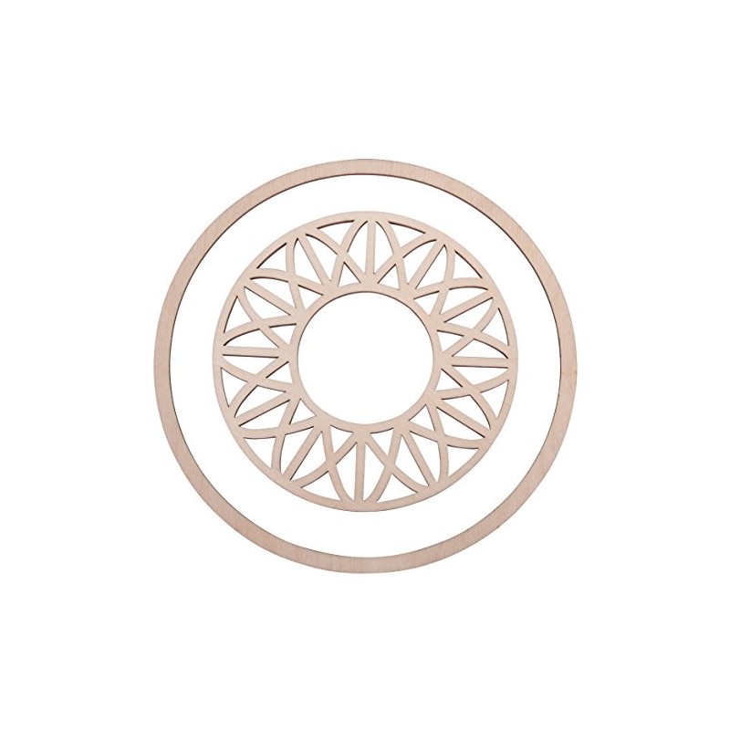 • Contents: 1 wooden disc 13 cm diameter, hole approx. 5.5 cm diameter, + 1 wooden ring 18 cm diameter, 6 mm wide, thickness approx. 3 mm, natural wood, filigree lasered in mandala design, with elegant brown edges