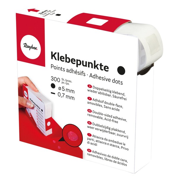 Rayher Hobby 30056000 Klebepunkte, transparent, 5 mmø, 0,7 mm, Rolle 300 Stück in Spenderbox, doppelseitig klebend, rund, wieder ablösbar, säurefrei, lösungsmittelfrei