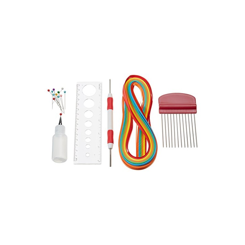 - This quilling starter kit contains 1 quilling tool, 1 comb, 1 circle template, 100 pre-cut paper strips, 10 pins, 1 refillable glue bottle with fine tip (empty), and detailed instructions. All materials are conveniently stored and organized in a clear storage box