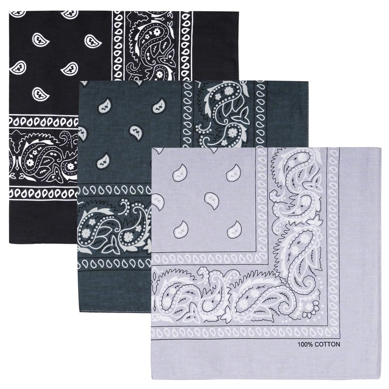 Raylarnia 100% Cotton Large Bandanas for Men and Women, 22 Inch Paisley Bandana with Multiple Colors, Black / Dark Gray / Light Gray, 22x22 Inch (Pack of 3)