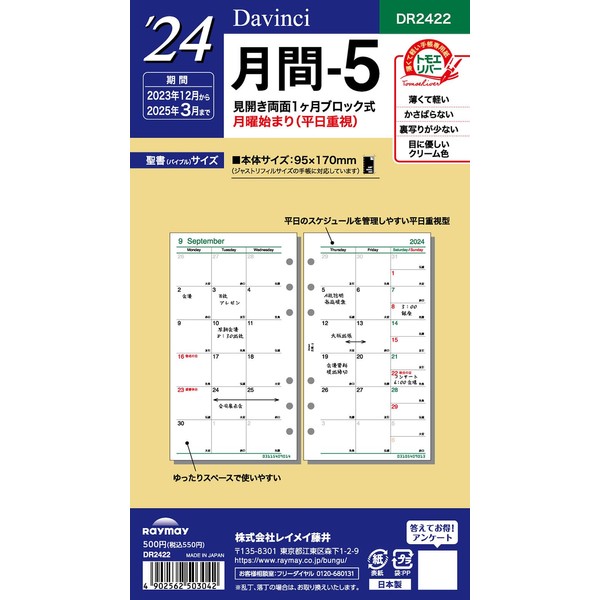 Raymay Fujii DR2422 Personal Notebook, Refill, 2024, Bible Size, 5 Monthly, Monthly DR2422, Begins December 2023
