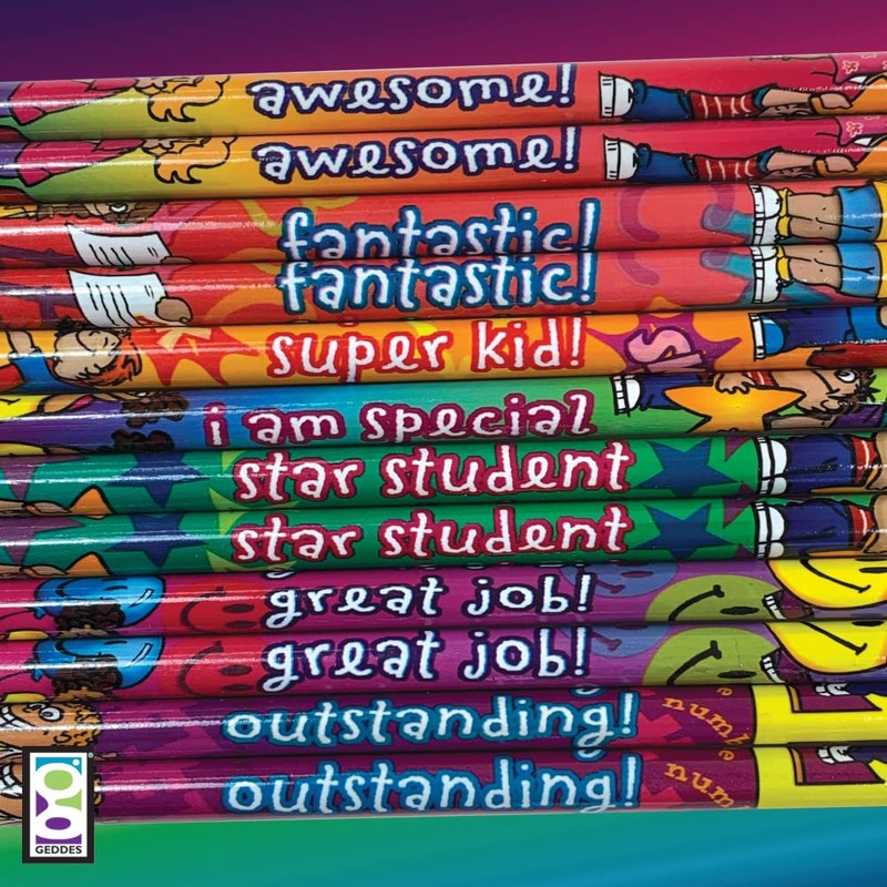 Raymond Geddes Incentive Pencils are great rewards and incentives for the kids or students. These Cartoon characters wrapped wood pencils can congratulate your kids for their special achievements. The Geddes Incentive pencils say Awesome!, You Did It!, Excellent!, Honor Student, I Am Special, Fantastic!, and more with their colorful cartoon characters and sayings.