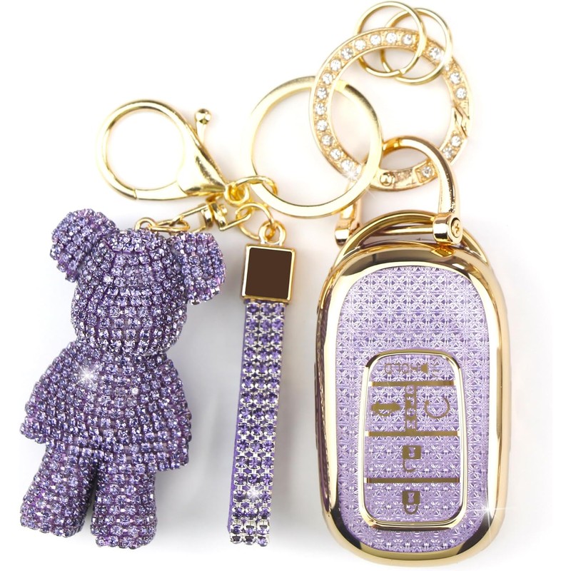 Rayslesan Cute Key Fob Cover with Rhinestone Bear Charm, Bling TPU Smart Key Case for Women, Compatible with Honda Accord Civic 2023 2024 2025 Honda HR-V CR-V 2023 2024 2025 (5-Button, Gold Purple)