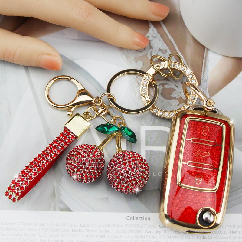 Rayslesan Sparkly Key Fob Cover with Cherry Keychain, Bling TPU Smart Key Case for Women, Compatible with VW Tiguan Passat (B7) Polo MK5 Touran Jetta (MK1-MK6) Beetle Scirocco (3-Button, Gold Red)