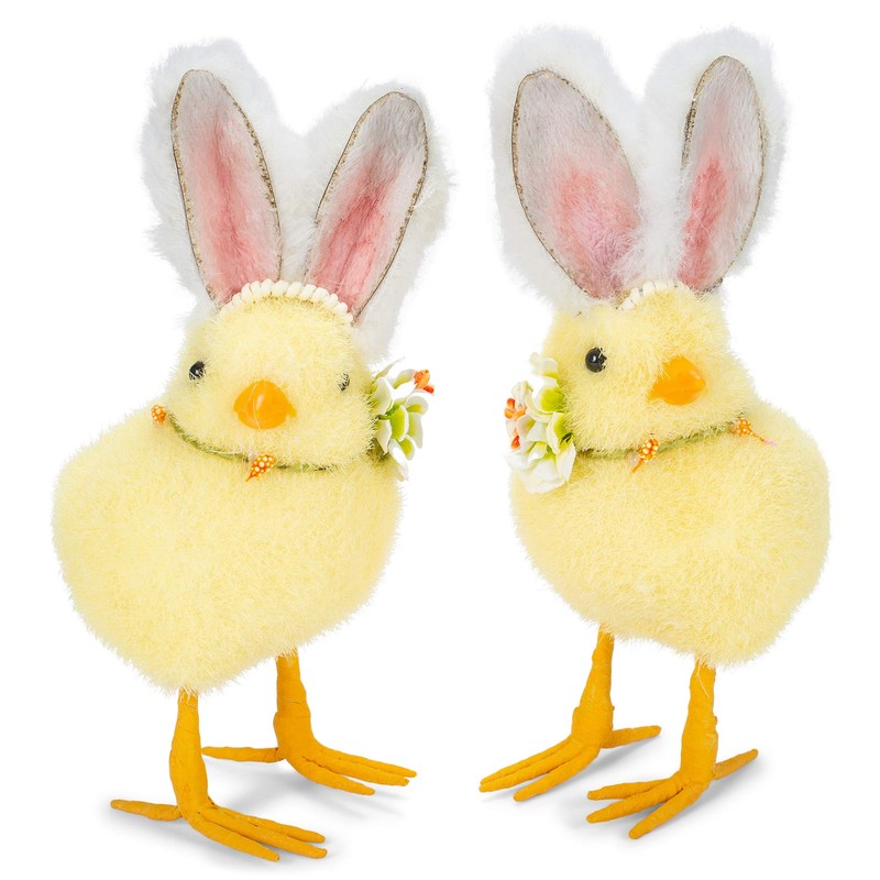 RAZ Imports has been the leading wholesale importer for holiday and home décor since 1979. We hand select the best quality products from around the world, and deliver them to retailers.. (Set of 2); Adorable tabletop chicks adorned with rabbit ears and floral necklaces. Each yellow chick is made of a durable polyfoam material and can be wiped with a dry cloth. Figurines measures approximately 7.5 x 4 inches tall and will bring smiles to any guests this Easter season. Perfect atop any shelf or nesteld on a mantel. Contained in protective packaging; Ready for gifting.