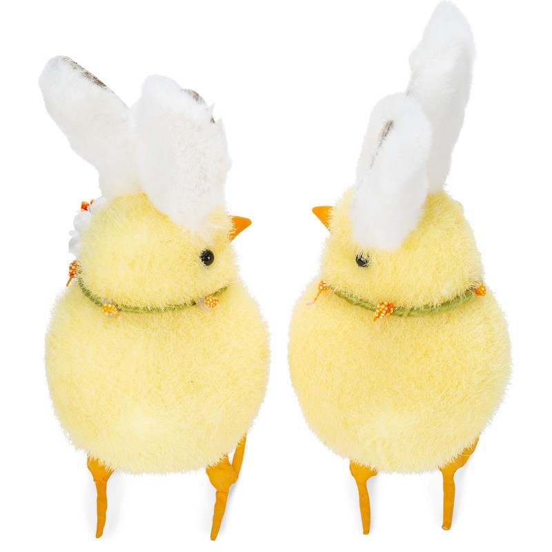 • (Set of 2); Adorable tabletop chicks adorned with rabbit ears and floral necklaces