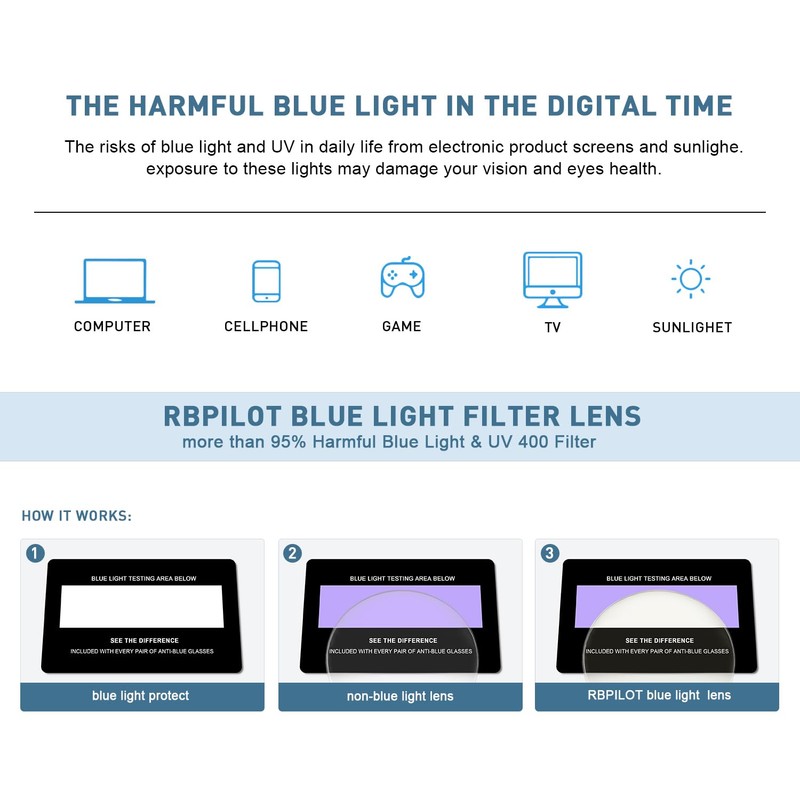 - 【ANTI BLUE LIGHT GLASSES】- Blue light blocker&UV400 Lenses, Alleviates visual fatigue and discomfort from browsing mobile phones, tablets, gaming and working under fluorescent lights with UVA/UVB protection and glare reduction.