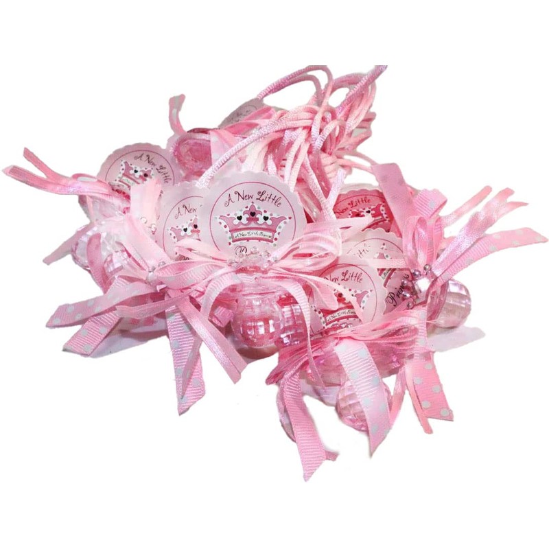 RBN 12 PCS Pacifier Ribbon Necklaces Little Prince and Princess with Crown Polka Dot Acrylic Baby Shower Game Favors Prize Decorations Boy Girl (Pink)