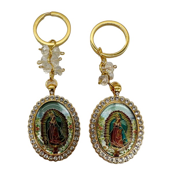 RBN Our Lady Guadalupe Virgin Mary Gold Party Favor Keychain Charm Keyring, Rhinestone Bling Communion Girls Baptism Recuerditos - 12 PCS