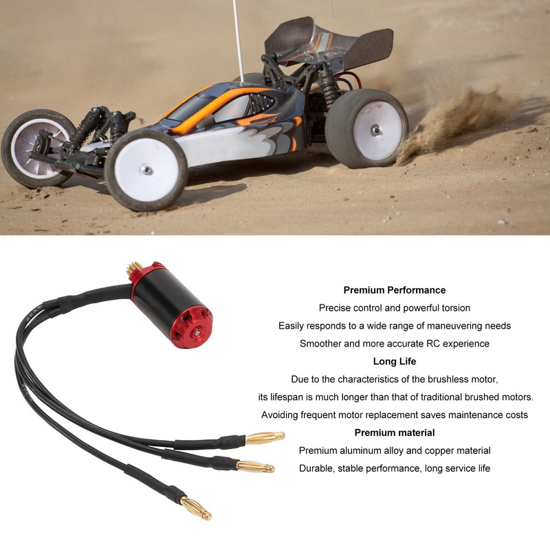 1、HIGH EFFICIENT: Adopting advanced brushless technology to provide strong power output, ensuring your RC car can run fast and stable in all kinds of terrain. 2、LOW NOISE: Compared with brushed motors, brushless motors make less noise during operation, making your RC experience more comfortable. 3、HIGH PERFORMANCE: The precise control and strong torsion of the RC car's brushless motor makes it easy to cope with all kinds of maneuvering needs, bringing you a smoother and more accurate RC experience. 4、LONG LIFE: Due to the characteristics of the brushless motor, its life span is much longer than that of traditional brushed motors. Avoiding frequent motor replacement saves maintenance costs. 5、PREMIUM MATERIAL: RC brushless motor is made of premium aluminum alloy and copper, durable, stable performance and long service life.