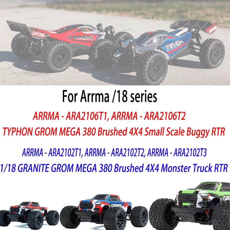 • 【Compatible with】: The RC Upgrade Parts for Arrma 1/18 Granite Grom Mega 380 Brushed 4x4 Monster Truck RTR & Typhon Grom Mega 380 Brushed 4X4 Small Scale Buggy RTR. Upgrade for original part numbers ARA330808.