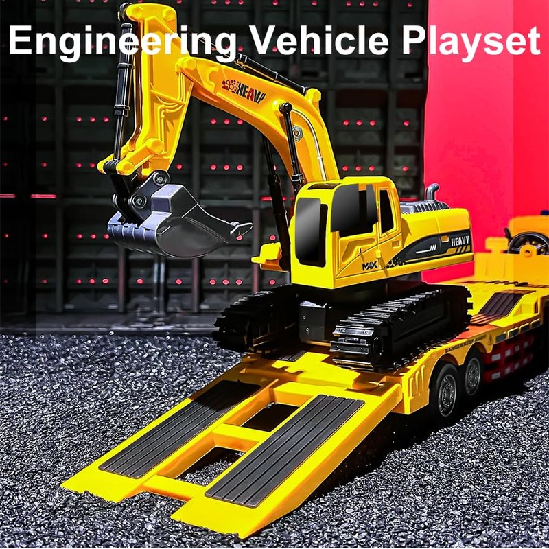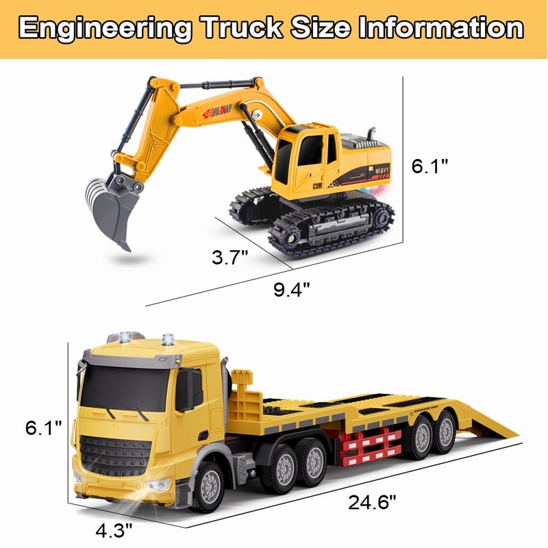 RC Semi Truck and Trailer & Excavator Toy Set - 11CH 24.6" Dual Control Mode Remote Control Engineering Vehicle with Sound & Lights, 2.4Ghz Flatbed Truck with Excavator Toys, Great Gift for Kids Boys