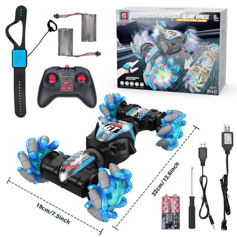 - 🚗 【2 Control Modes】- Different from other gesture rc car,The rc stunt car is not only can be controlled to move by traditional remote control,but also by a watch. Change your gesture,the RC car can sensing the change of your gesture to drives and transforms as you like.