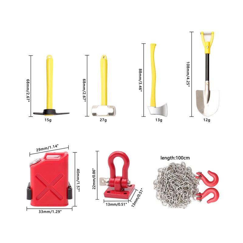 Rchobbytop 8pcs RC 1/10 Rock Crawler Scale Decoration Accessories Mini Shovel Hammer Axe Pickaxe Gas Can Winch Shackles Tow Chain Hook for TRX4 SCX10 D90 D110 TF2 CC01 Redcat Gen7 Gen8