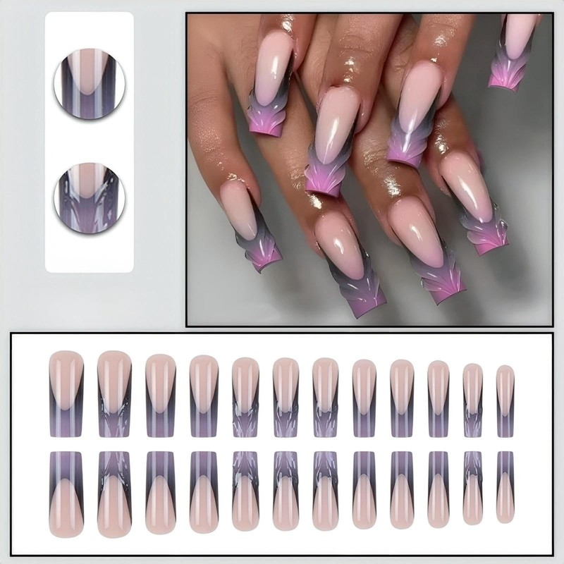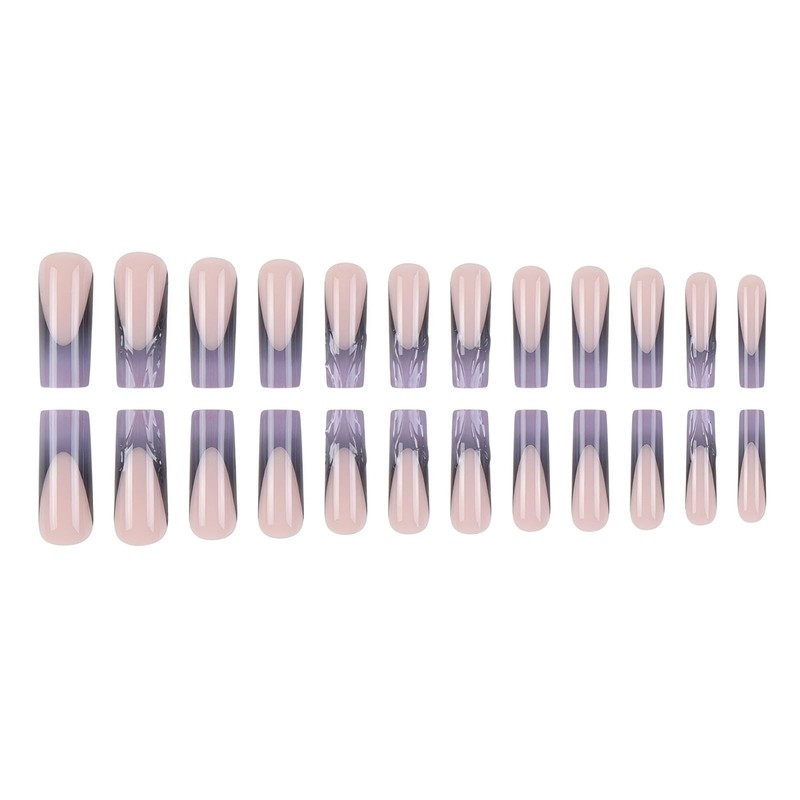 Rchovsam Long Square Press on Nails xl French Tip Fake Nails 3D Ripples Design False Nails Purple Gradient Stick on Nails Summer Full Cover Artificial Nails for Women 24pcs