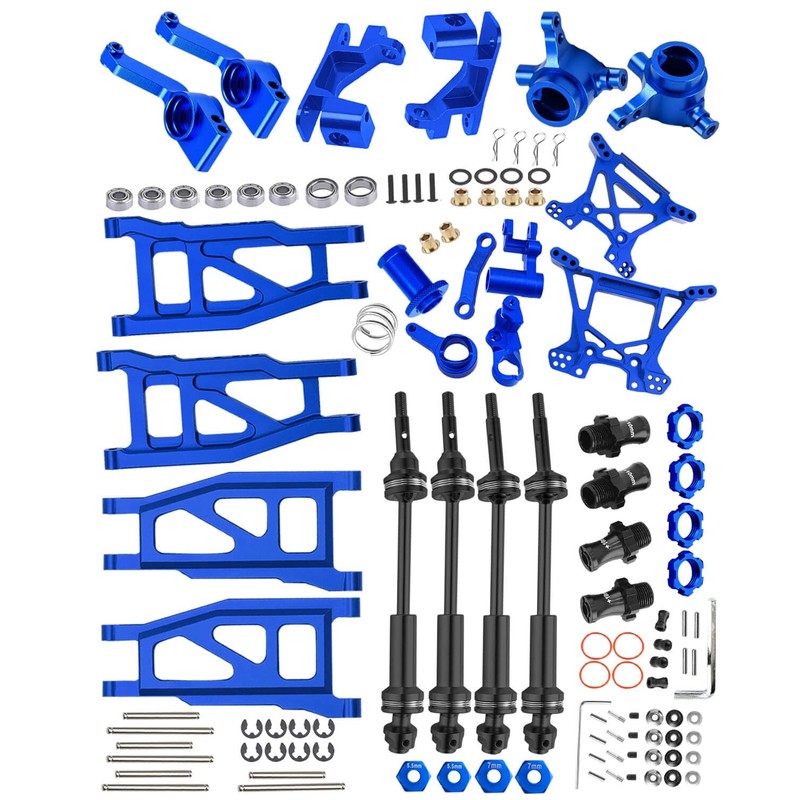 - 【Package Includes】: 2 x steering hub carrier ; 2 x C hub carrier ; 2 x rear hub carrier; 2 x Aluminum Front Suspension Arms; 2 x Aluminum Rear Suspension Arms; 1 x Steering Bellcrank Drag Link Set; 1 x Aluminum Front Shock Tower Shock Mounts ; 1 x Aluminum Rear Shock Tower Shock Mounts; Front Rear CVD Axles w/Hex & 12mm to 17mm Hex Hub Adapters;Also comes screws for easy install.