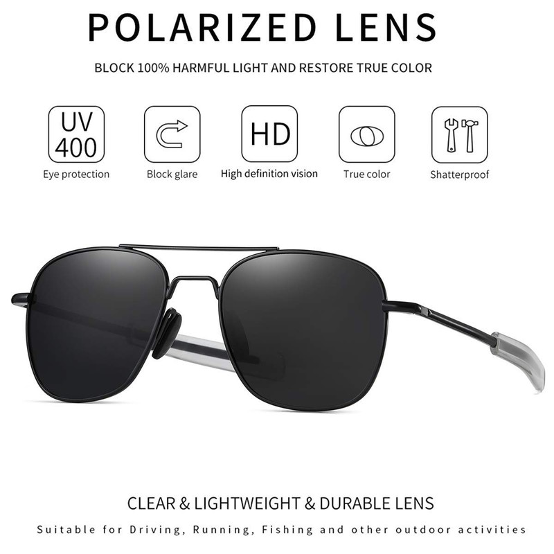 - TAC Polarized & UV Protection Lens - Rcxkoom square aviator sunglasses for men can block 100% of both UVA and UVB radiation. The military style aviator polarized sunglasses are essential for filtering out sunlight reflected glare and protecting your eyes against long term UV damage when you go out. Visually restores true color, eliminates reflected and scattered light.