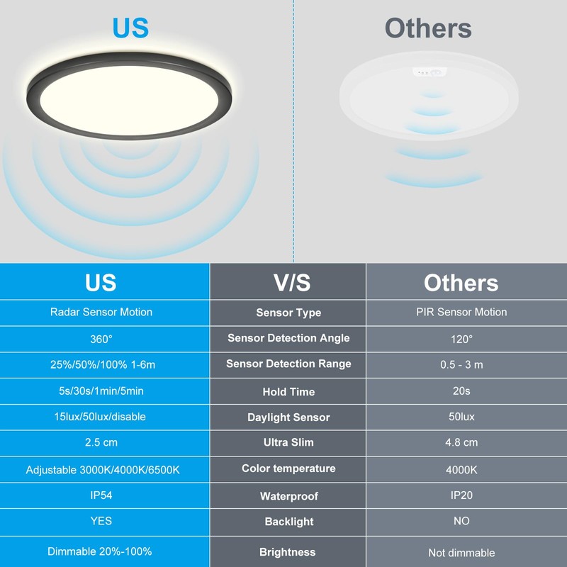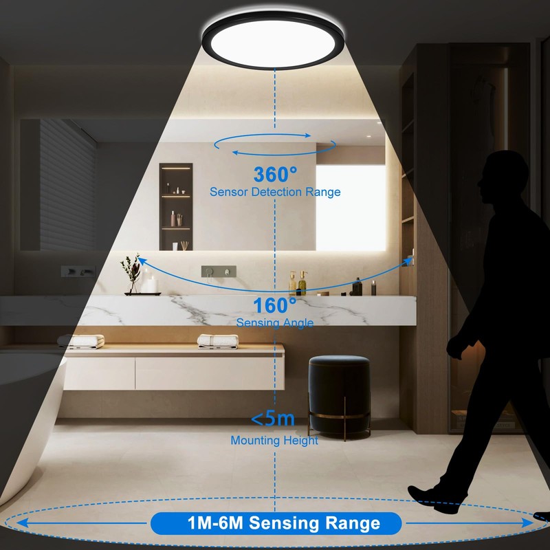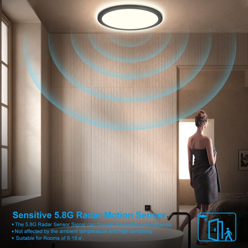 - LED ceiling light dimmable with motion sensor: this LED ceiling light is equipped with a 5.8G radar motion sensor and light sensor. This ceiling light with motion sensor turns on immediately when motion is detected within adjustable detection range (1.5 m/3 m/6 m), and if no motion is detected, the lamp turns off automatically after adjustable holding times (5s/30s/1min/5min).