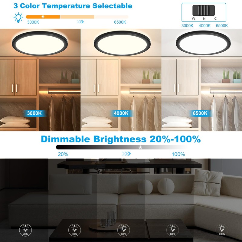 - Dimmable brightness and 3 adjustable colour temperatures: with the slide switch on the back of the sensor ceiling lamp, the light can be adjusted to 3000 K warm white, 4000 K natural white, 6500 K cold white; you can adjust the colour temperature of this sensor light according to different scenes and needs. With the remote control, the brightness of this 18 W LED ceiling light can be freely adjusted from 20% to 100%; if you set this lowest brightness, the power is only 3.6 W.
