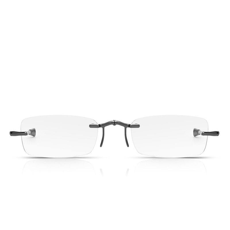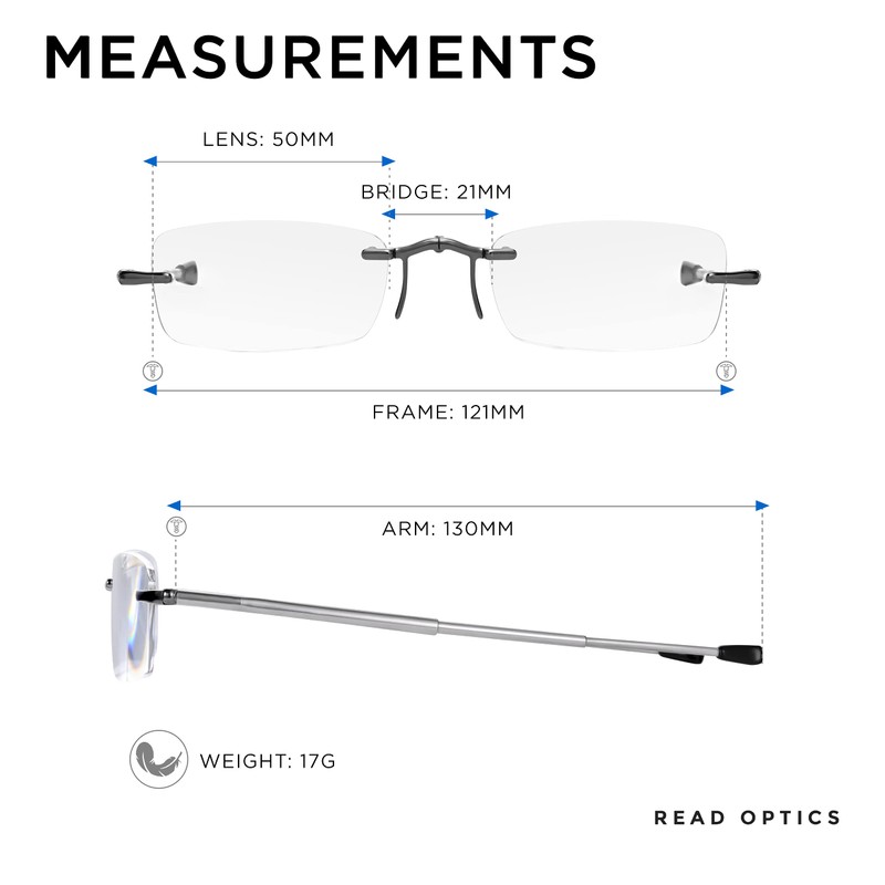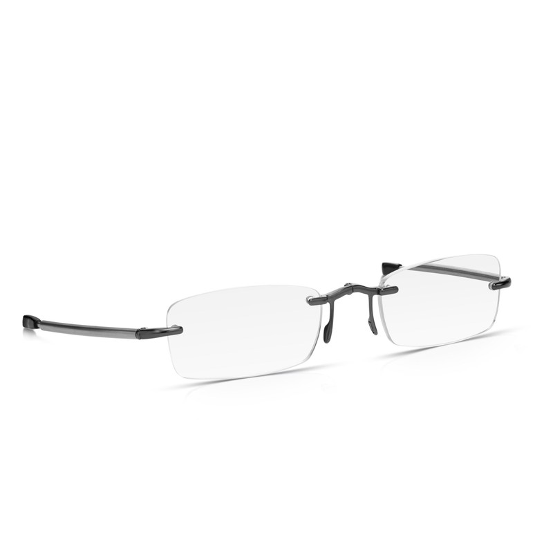 - Frameless glasses. Perfect if you prefer less noticeable and lighter glasses. Nose bridge and side frame in gunmetal silver with shiny black temples