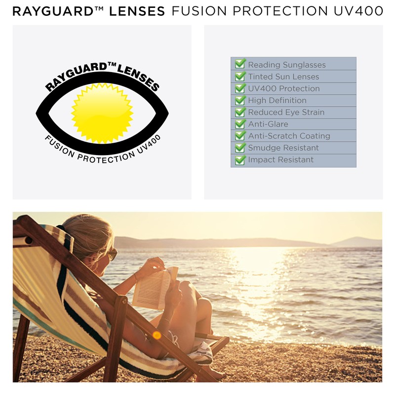 - CHOOSE YOUR GLASSES STRENGTH. +1, +1.5, +2.0, +2.5, +3.0, +3.5. Non-reflective, anti-glare, optician-grade slimline lenses with UV protection. Smudge, scratch and shock resistant lenses. The reading sunglasses have grey tinted lenses to protect against UV rays and bright sunlight.