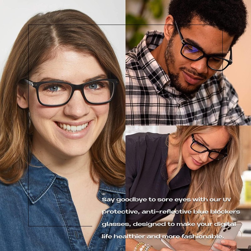 - Lentes de bloqueo de luz azul. Ya sea tu computadora en el trabajo, la televisión en casa o incluso tu teléfono, la mayoría de nosotros pasamos la mayor parte del día mirando pantallas. Esto puede crear tensión ocular, lo que resulta en dolores de ojos y dolores de cabeza al final del día. Protege tus ojos de la dura luz azul de nuestros dispositivos diarios.