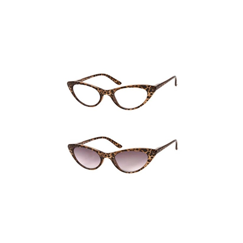 - You will be the cat's meow with the Ashlee Sun Reader and the Brit Reading glasses! Both of these glasses are full framed with a vintage cat eye shape. The Ashlee Sun Reader has a tinted, acrylic lens with 99% UVA / UVB sun protection, The Brit Reader has a clear, acrylic lens and both glasses have full magnification. Their lightweight retro frame features an uber-chic cat eye shape in solid black and leopard print. Available colors: Black, Brown Leopard. Available in 2 Pack only