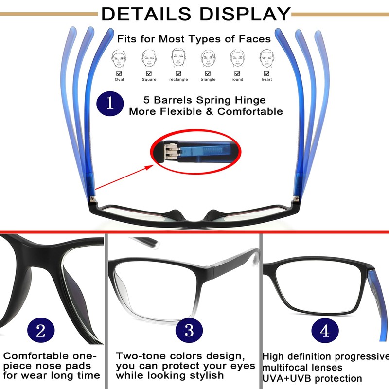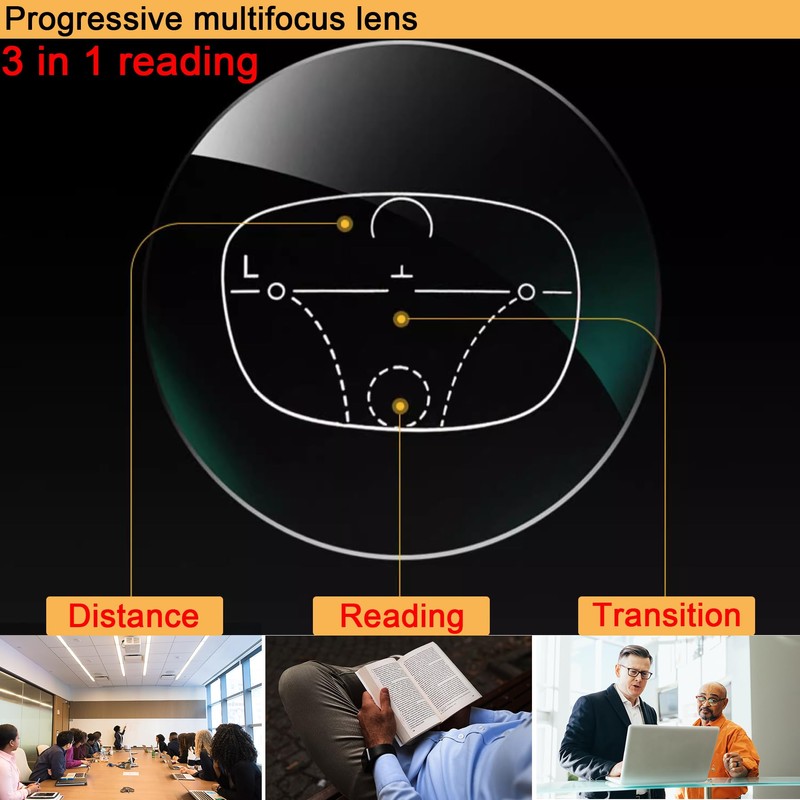 - 【Mens Progressive Multifocus Reading Glasses】: Progressive Reading Glasses Features Multifocal Lenses With 3 Different Visions.Top Of The Lens For Distance Vision,The Middle And Bottom Are Appropriate For Computer Use And Close Reading,These Accomplish All With A Gradual Change From Top To Bottom.These Progressive Reading Glasses Work Great At Any Distance,Whether Reading A Book,Working On A Computer Or Walkin,Shopping And So On.They Are Just What You Needed!