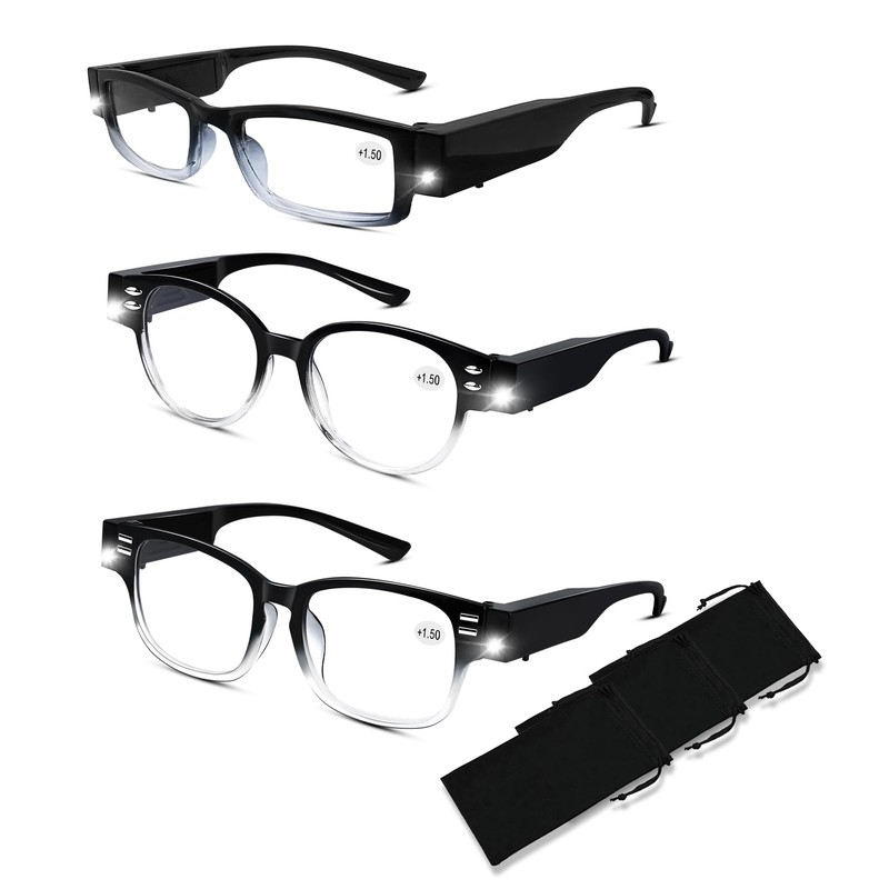 - [3 Styles Reading Glasses with LED Lights] You will receive 3 different styles of lighted reading glasses. Fashion design, hands free magnifier eyeglasses are the perfect replacement for a handheld magnifying glass. these magnifying glasses are not limited to the elderly, and its design purpose is to magnify the details of objects. Fashion glasses help you to have a clear vision with or without the lights.