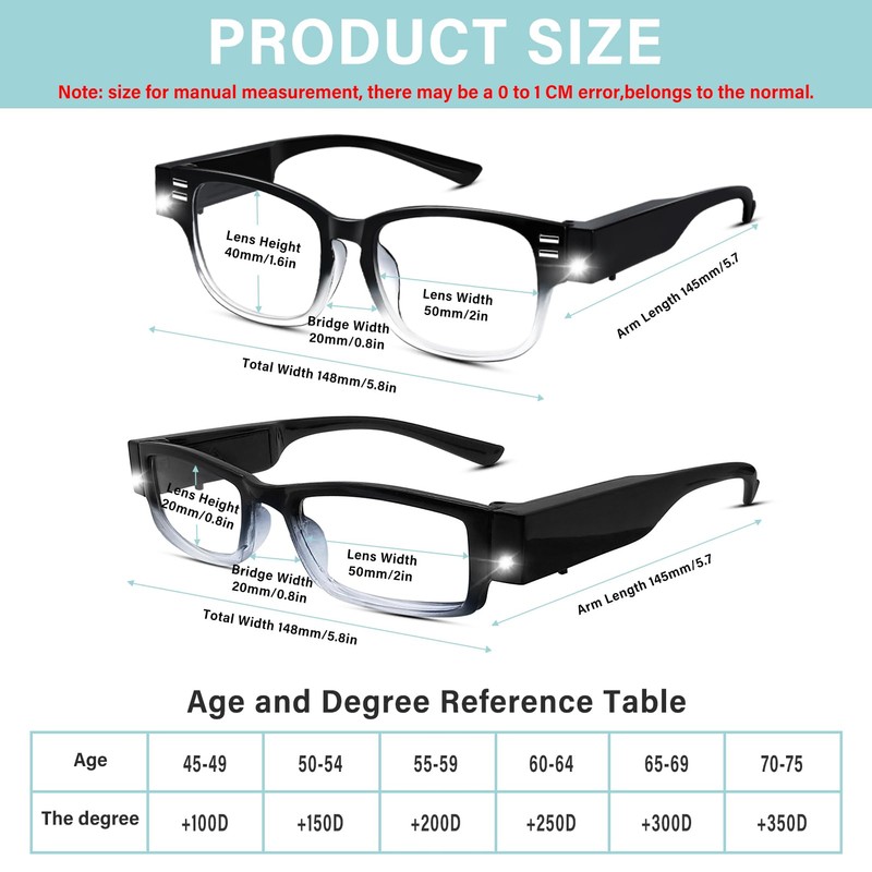 - [Reading Glasses with Lights and Magnifier] Fashion pattern design reading glasses for women/men and older people. Lens Width:50 mm/2 in, Bridge: 20 mm/0.8 in, Arm Length: 145 mm/5.7 in, Total Frame: 148 mm/5.8 in; Usually 1.0 fit for 45-49year old,1.5 fits 50-54year old,2.0 use for 55-59-year-old,2.5 fits 60-64-year-old,3.0 fit for 65-69-year-old,3.5 fits for 70-74-year-old. There are six reading glasses with different power of lens for you to choose from.