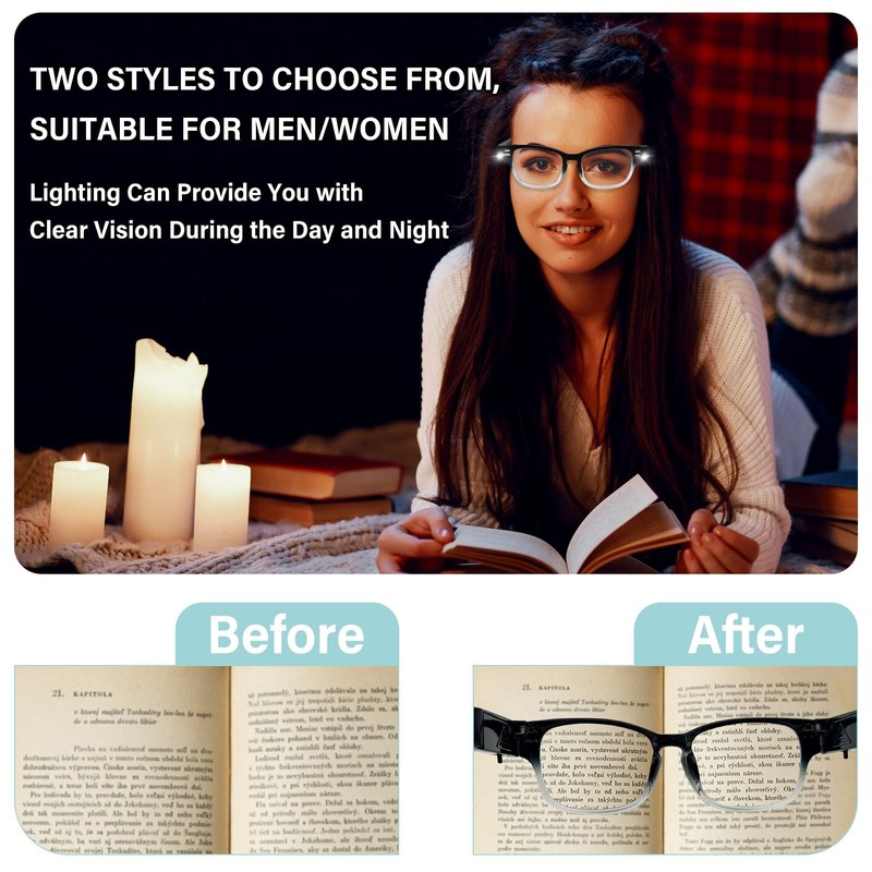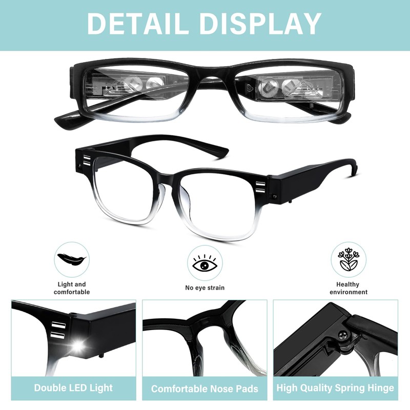 - [Reading Glasses with Lights Built-in] Unlike traditional reading glasses, the reading glasses built in dual bright LED lights, which can help you see brighter and clearer in a dim environment. You just need to turn on the switch to get the illuminating light you need! Perfect for use in the car, in bed, on a plane, on a camping trip, or in a place too dark to read without disturbing others around you.