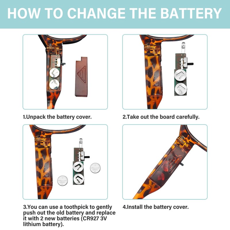 - [Magnifying Glasses with Light] The magnifying glass for reading with lightweight plastic frames flexible spring hinges and temples, and an ergonomic design, can reduce the pressure on the nose. Suitable for long-time wearing. Lighted reading glasses built-in LED bright lights help you to have clear vision with or without the lights.