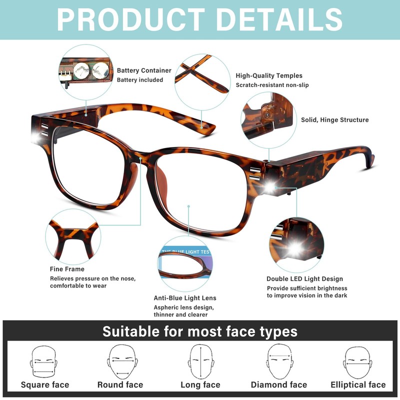 These reading glasses with lights are made of high quality material, fashion classic design, easy to carry or store. Unlike traditional reading glasses, there are built-in dual bright LED lights, which can help you see brighter and clearer in a dim environment and keep your hands free! Great for Hobbies, Reading, Close Work, and Crafts.