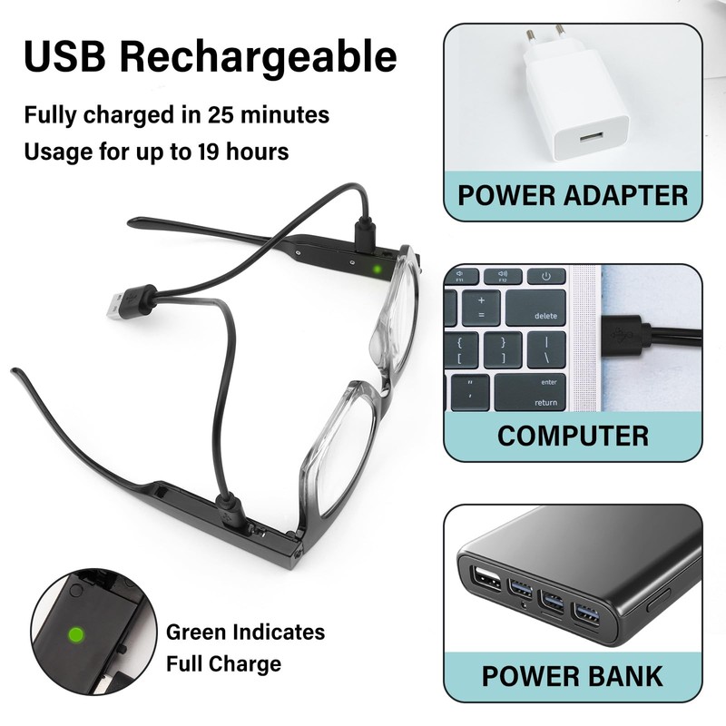 - [USB Rechargeable Reading Glasses] This magnifying glasses with light is equipped with a rechargeable design and comes with a USB Type-C cable.Just find a computer or USB power adapter (not included),and you can recharge everywhere.It only takes 10 minutes to fully charge and can provide you with continuous brightness for 19 hours.Readers built-in LED bright light on each side of the frame and powered by a dual battery mode for long-lasting performance,you will never need to buy batteries again!