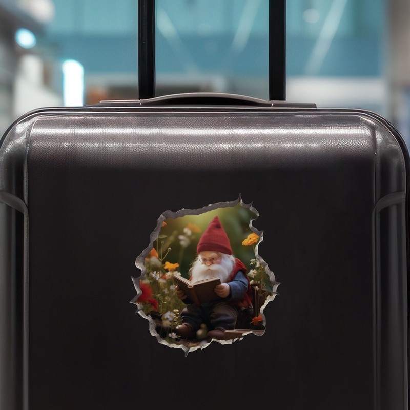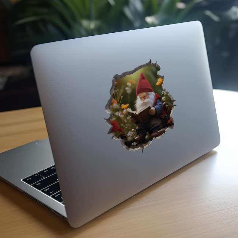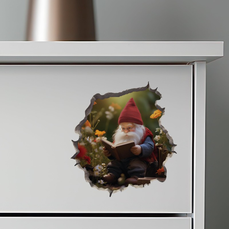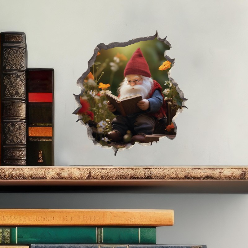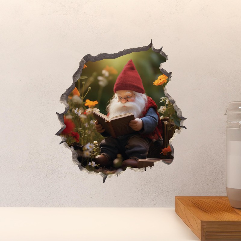 Behold the hole, a gateway to realms untold, A glimpse into wonder, a story yet to unfold. Within that enchanted gap, a garden comes alive, A gnome, lost in literature, with stories to revive. His pointed hat adorned with stars, a mystical crown, Pages turn with secrets, as he reads with a profound frown. Surrounded by flowers, a kaleidoscope of hue, Whispering tales to petals, each blossom listens anew. In this mystical realm, dreams dance upon the air, As the gnome ventures through stories, without a single care. Escape into this enchantment, where walls dissolve with ease, As this 3D Wall Sticker unveils a world that truly frees.