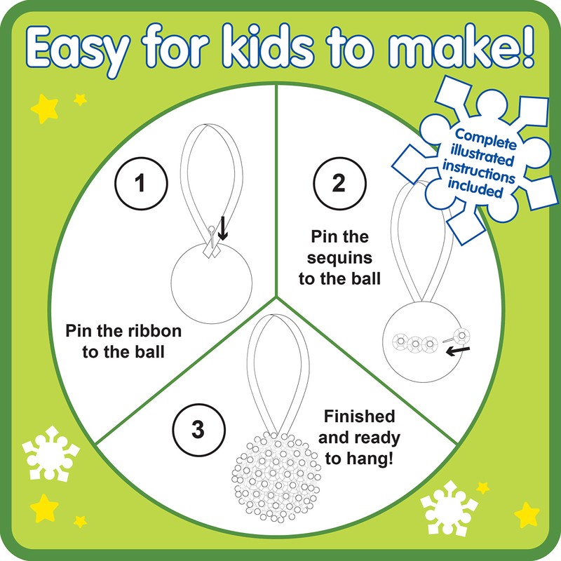 - COMPLETE CRAFT KIT - This DIY Christmas tree decorations kit includes everything you need: 6 polystyrene foam balls, ribbons, coloured sequins (red, green, silver, gold), plastic pins and illustrated instructions