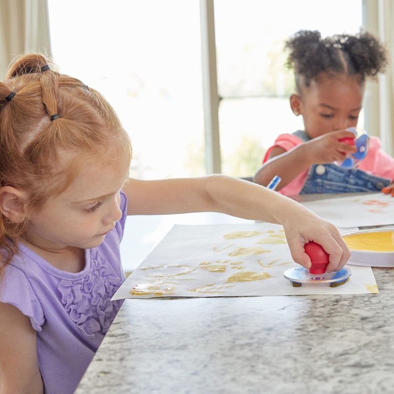 - KID-FRIENDLY DESIGN -- Each stamp has directional arrows on the transparent plastic discs for perfect image alignment every time! The stamps are also labeled for quick identification