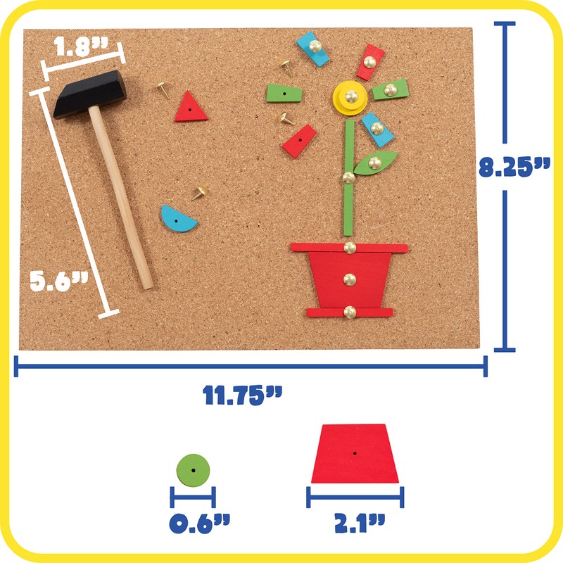 - TAP, TACK AND CREATE! -- This hammer toy set includes 100 wooden shapes in 4 colors (red, green, blue and yellow), 1 hammer, 1 corkboard, 100 metal tacks and easy-to-follow instructions.