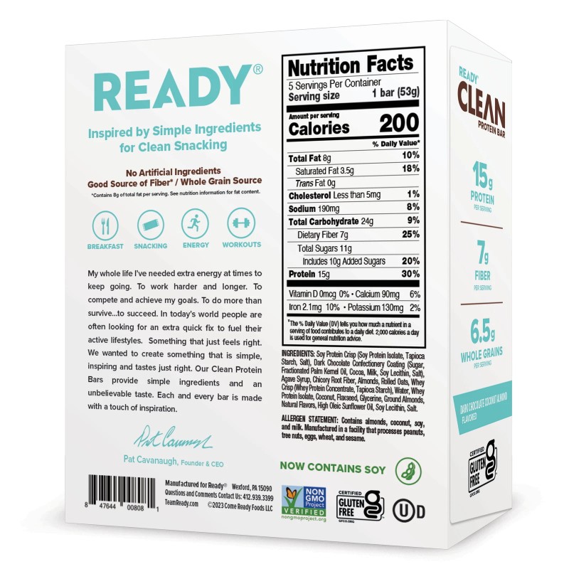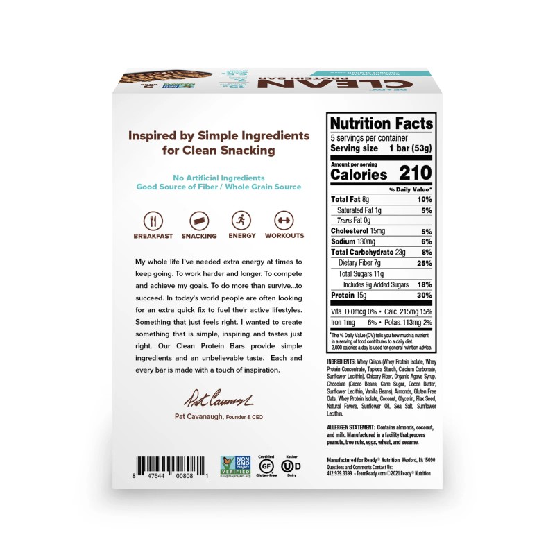 Ready® Bars are scientifically formulated to energize the healthy lives of people of all ages—from young athletes to active lifestyle adults. Our natural and clean ingredients help shape and sustain fitness at all levels. Whether it be powering through the busyness of the day, fueling workouts, supporting recovery, or assisting in healthy weight management. Packed with a wellness powerhouse of functional ingredients that energize your day. Ready® Bars feature high quality whey and plant-based proteins to support muscle function, healthy fiber to promote gut health and nutrient-rich whole grains to satisfy cravings. Plus, there’s a secret ingredient—the Ready® Mentality—infused in each and every bar.