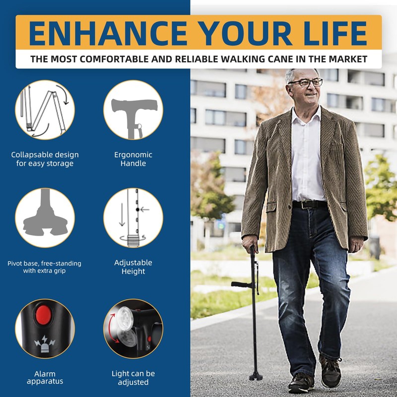 Oulisen Folding Cane With Led Light And Alarm, With Side Handle, Folding, Adjustable Cane Suitable For Arthritis Disabled And Elderly, Cane With Cushioned T Handle And Swivel Four Pedestal, Black.
