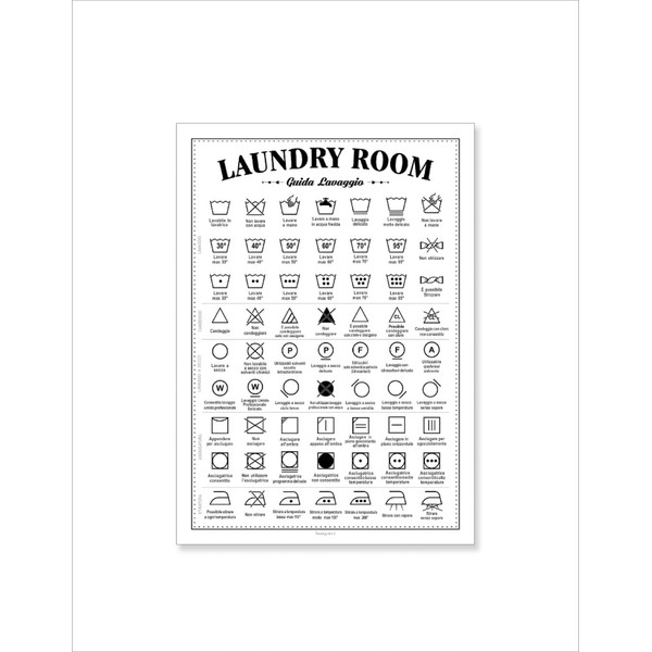 MIini poster A4 (21 x 29.7 cm) with washing instructions with 63 symbols and an explanatory description for the care of the clothes indicated on the labels with instructions for proper care. The symbols indicate exactly whether hand wash or machine wash, dry clean or other necessary instructions for the care of delicate and hard-wearing clothing. A useful piece of furniture as well as a simple wall decoration for the laundry room "Laundry Room". An exclusive readyprint graphic, made thanks to careful research, was attempted to include in this print all common symbols and even the lesser known symbols for the care of clothes, so they were all present in the only useful place near washing machine, detergents and dryers. For homemade laundries and/or dry cleaning - material uses thick cardboard of 300 g. High-quality and detailed print, made with professional materials and equipment, made in Italy by Readyprint - Made in Italy