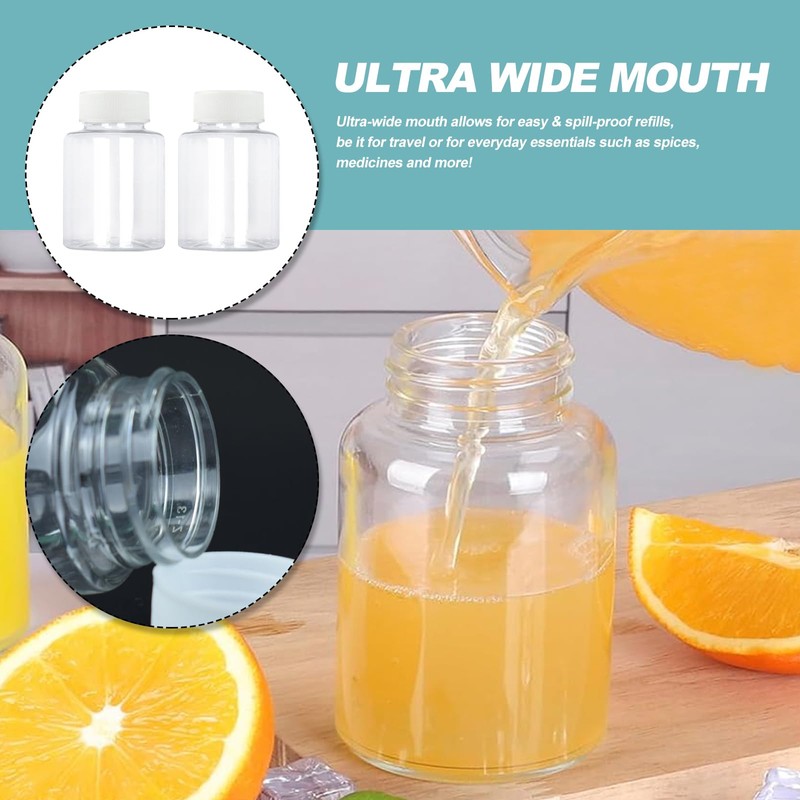 - ✅【Package Content】You will get 12 pcs 100ml plastic juice bottles with white lids, with a mouth diameter of 2.8 cm, a bottom diameter of 4.7cm and a height of 5.7cm.