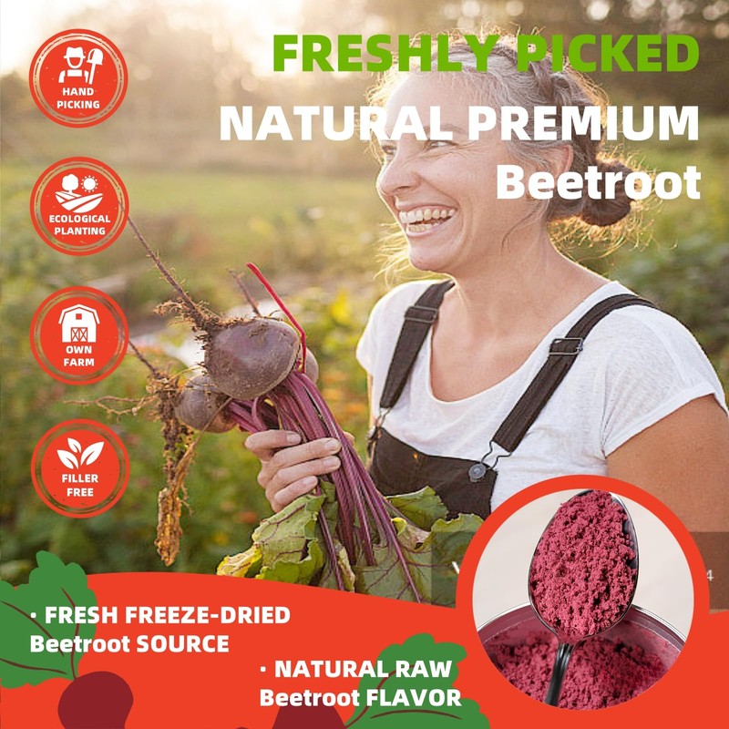 - Fresh and natural beets are picked. After cleaning, freeze dried process and Japanese milling technology are used to retain the essence of beets, with a variety of ingredients needed by the human body