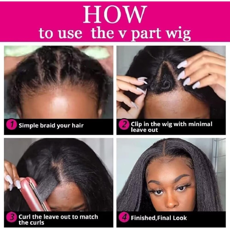 - V part wig material: 100% Brazilian human hair. Can be dyed, tempered, bleached and styled as your own hair. V part wig human hair kinky straight soft and comfortable.