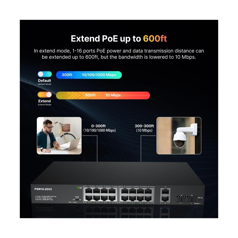 - Extend FunctionUp to 600ft data and power PoE transmission range under Extend Mode, ideal for surveillance system (Speed will be reduced to 10 Mbps if extend function is operating, only good for one camera each port).